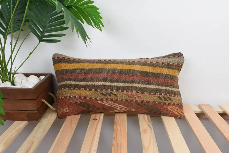 Almohada de tiro a rayas rojas y marrones, almohada de lino bordada hecha a mano