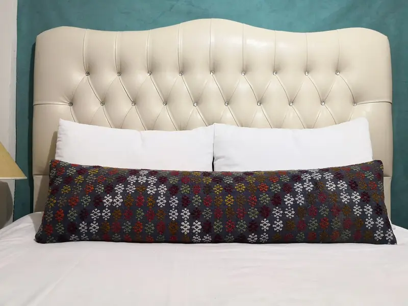 Almohada de lanzamiento de lana geométrica azul y blanca hecha a mano, almohada rectangular vintage