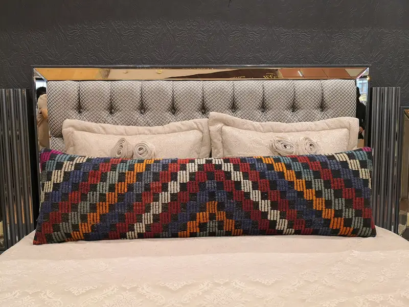 Almohada geométrica de lanzamiento de lana roja y bronce, almohada rectangular hecha a mano