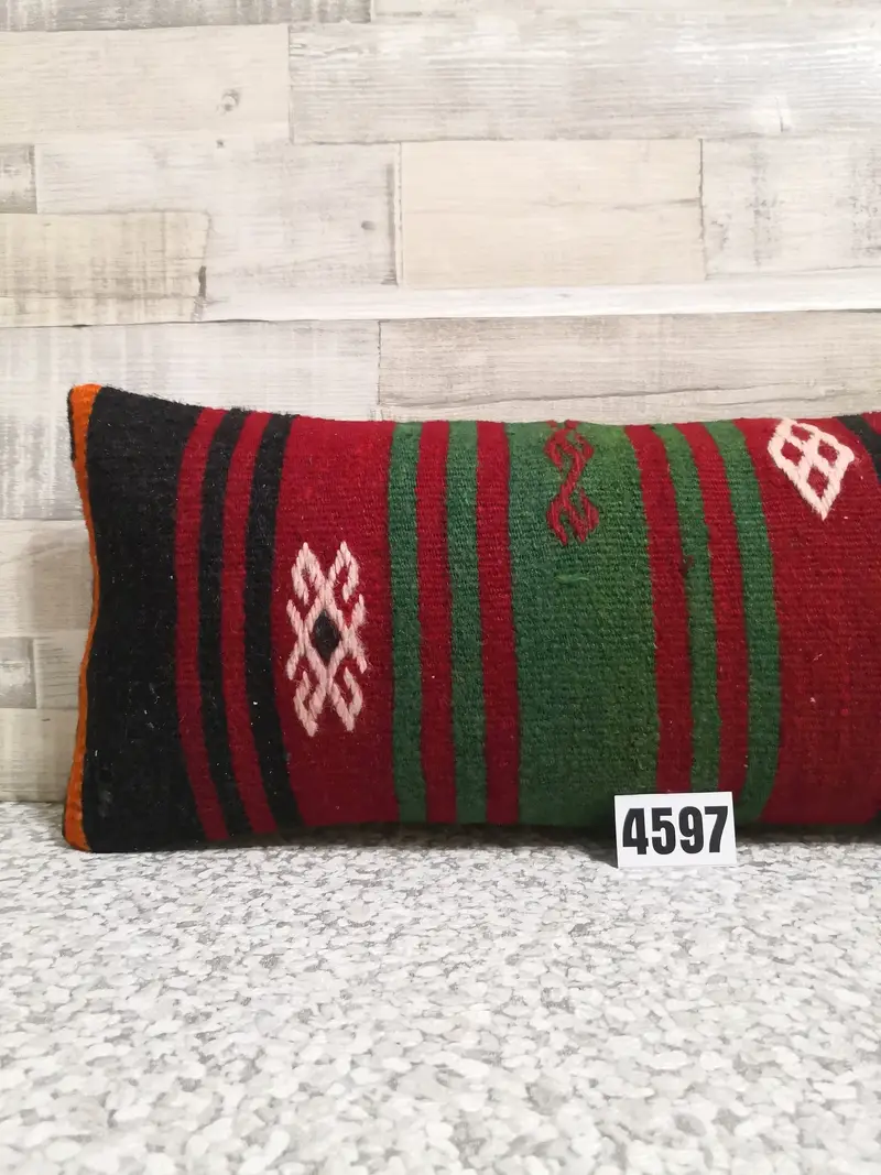 Almohada rectangular de lana a rayas rojas y verdes, almohada con cremallera vintage