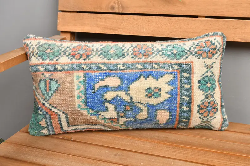 Almohada de tiro bordada azul y marrón, cojín vintage hecho a mano