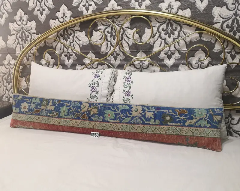 Almohada de lanzamiento de lana floral azul y roja hecha a mano, cojín rectangular de 8x48 pulgadas