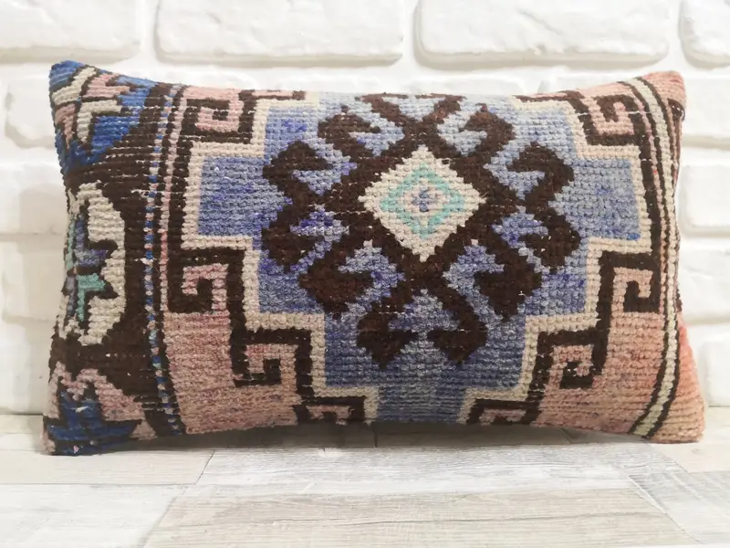Almohada de lanzamiento de lana geométrica azul y gris hecha a mano, almohada rectangular vintage