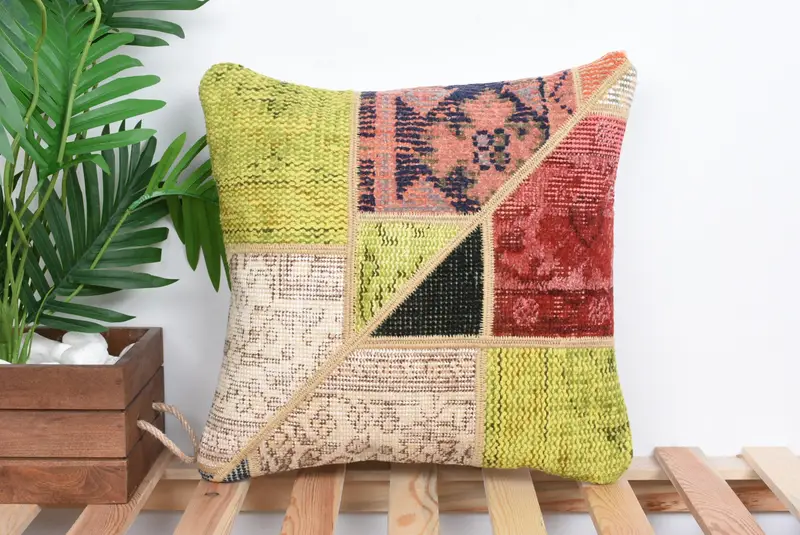 Almohada de lanzamiento de patchwork verde y rojo, almohada bordada hecha a mano
