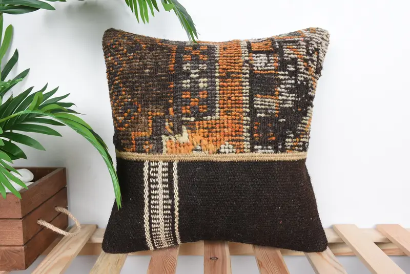 Almohada de lanzamiento de patchwork naranja y marrón, cojín bordado 16x16