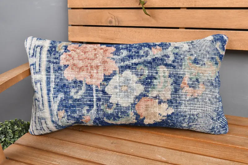 Almohada bordada floral azul y marrón, almohada de tiro hecha a mano de 12x24