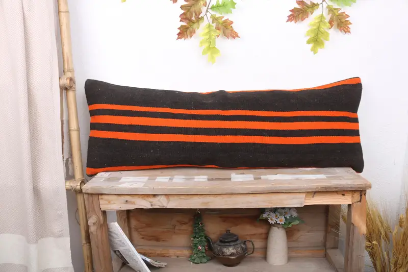Almohada de tiro a rayas marrón y naranja, cojín bordado hecho a mano