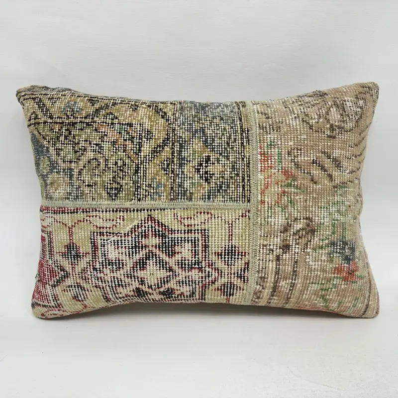 Almohada de lanzamiento de patchwork azul y beige, cojín rectangular hecho a mano