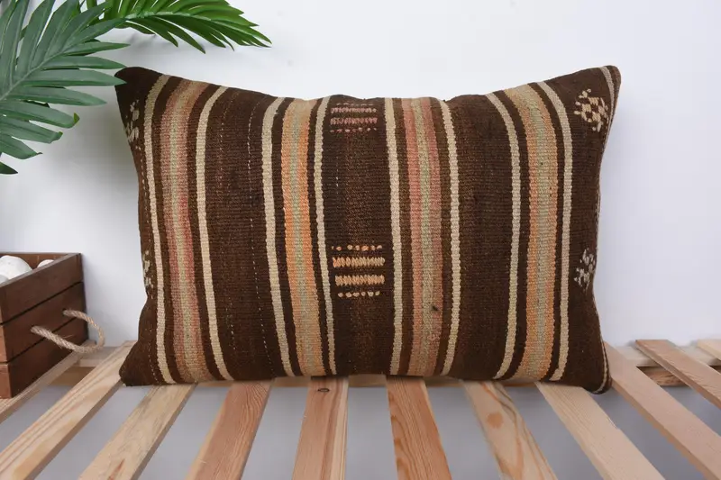 Almohada de rayas marrón y beige bordada, almohada de lanzamiento rectangular hecha a mano