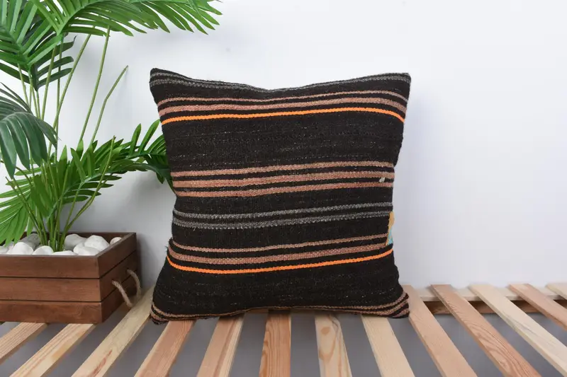 Almohada de tiro a rayas marrón y beige, cojín de lino bordado