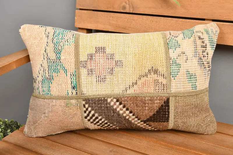 Almohada de tiro de lino bordado, almohada de tiro de patchwork beige y marrón