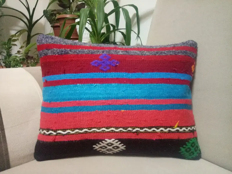 Almohada bordada de lana a rayas rojas y bronce, cojín vintage hecho a mano
