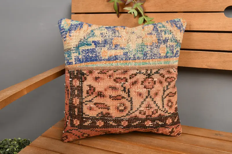 Almohada de lanzamiento de patchwork azul y marrón bordado, cojín vintage hecho a mano