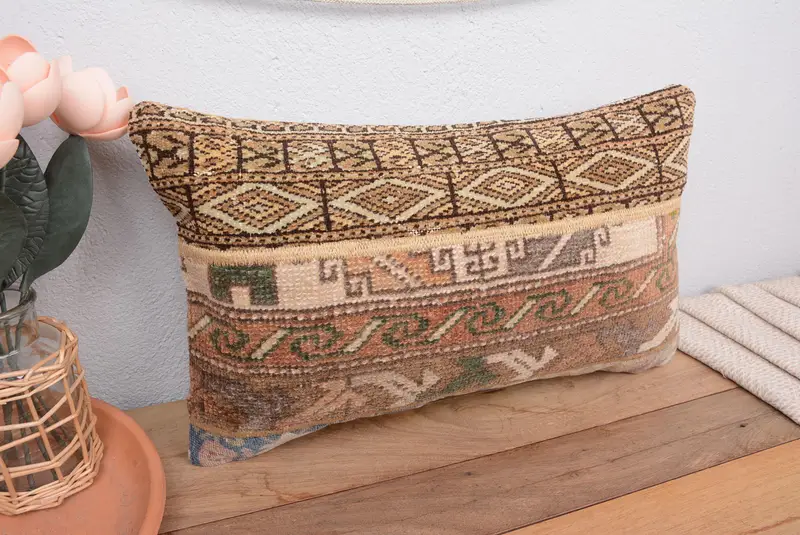 Almohada de patchwork marrón y beige hecha a mano, almohada de lanzamiento bordada de 12x20