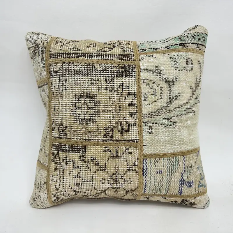 Almohada de tiro bordada beige y marrón, almohada de patchwork hecha a mano