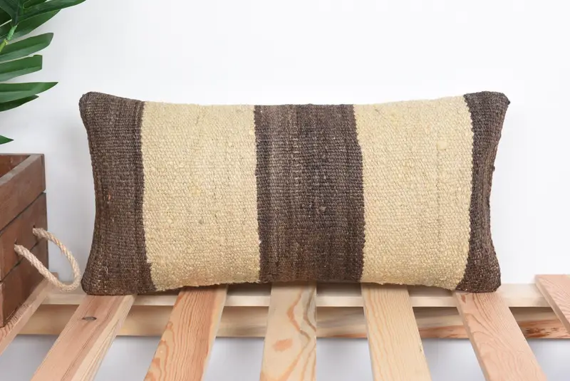 Almohada de tiro beige y marrón bordada, almohada de rayas vintage