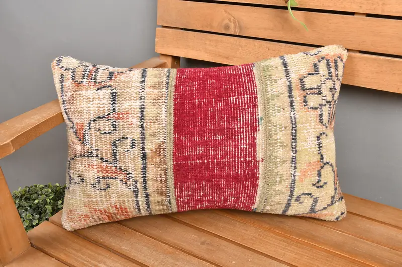 Almohada de lanzamiento de patchwork rojo y beige, almohada bordada de 12x20