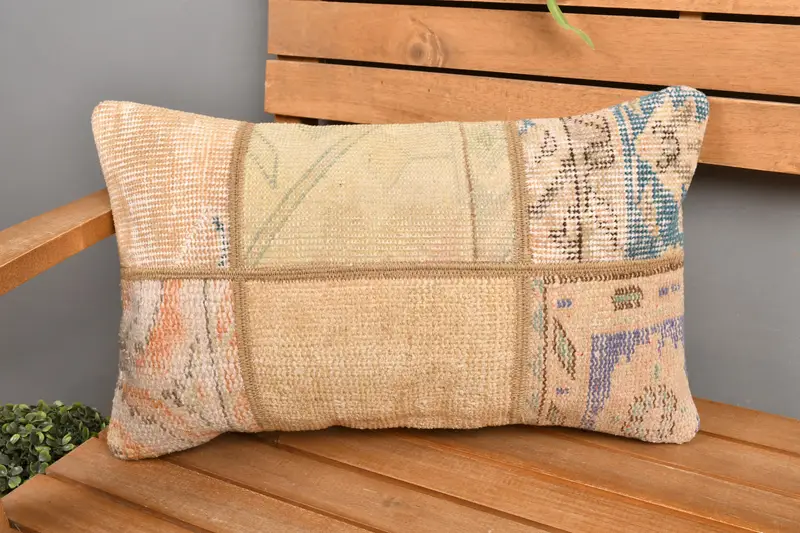 Almohada de tiro patchwork beige y bronce, cojín rectangular hecho a mano