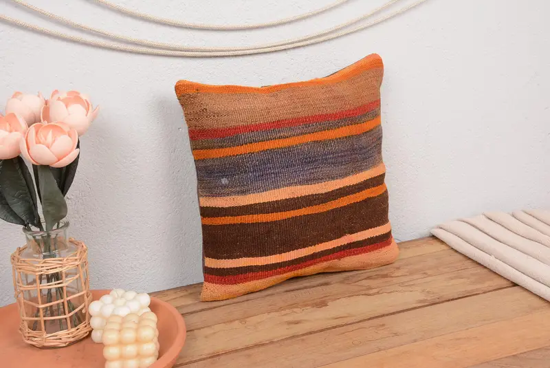 Almohada de tiro a rayas azules y marrones, almohada de lino vintage bordada