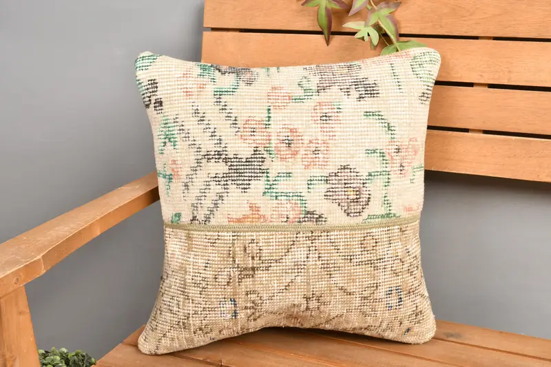 Almohada de lanzamiento de patchwork beige y verde, cojín bordado hecho a mano
