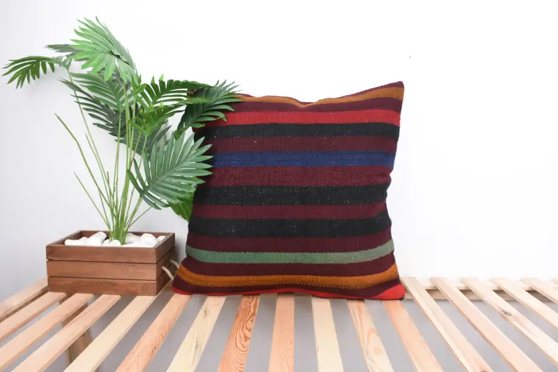 Almohada de tiro Kilim de rayas rojas, cojín bordado vintage