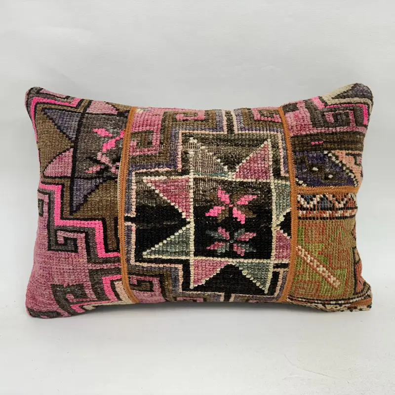 Almohada de patchwork marrón y rosa bordada, almohada de lanzamiento vintage hecha a mano