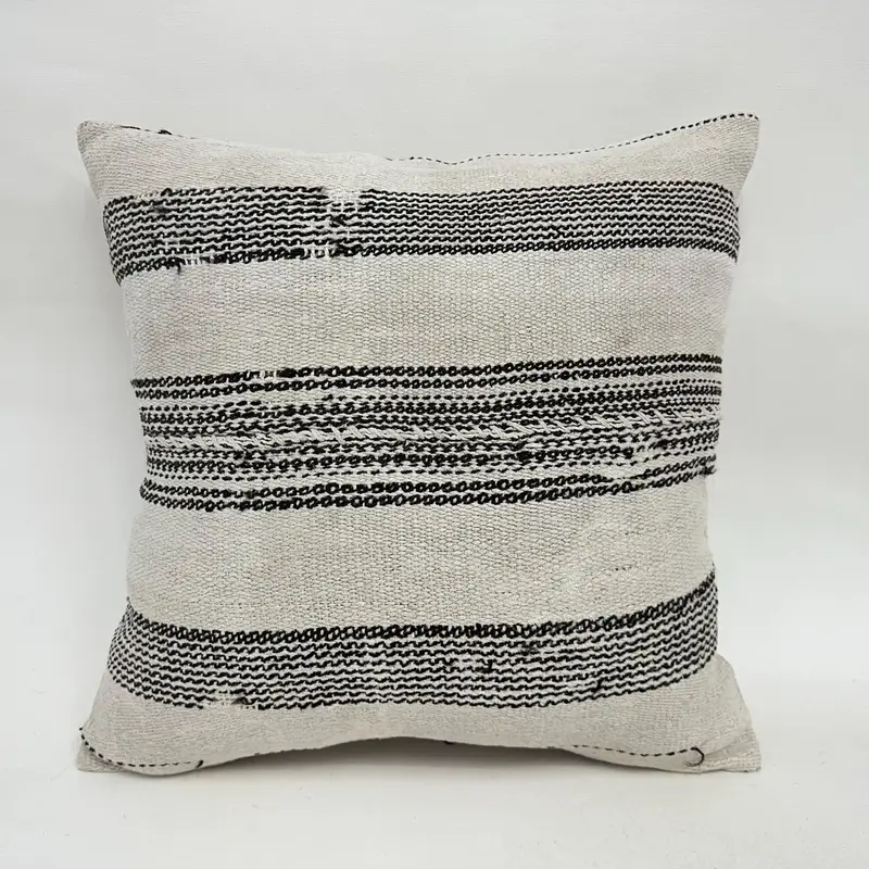 Almohada de tiro a rayas beige y marrón, cojín bordado vintage