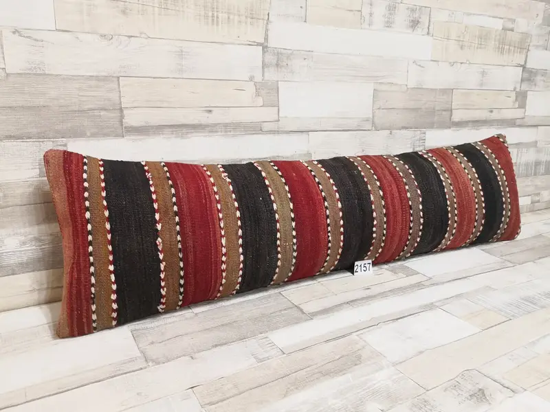 Almohada de lanzamiento de lana a rayas rojas y marrones, almohada rectangular hecha a mano de 12x48 pulgadas