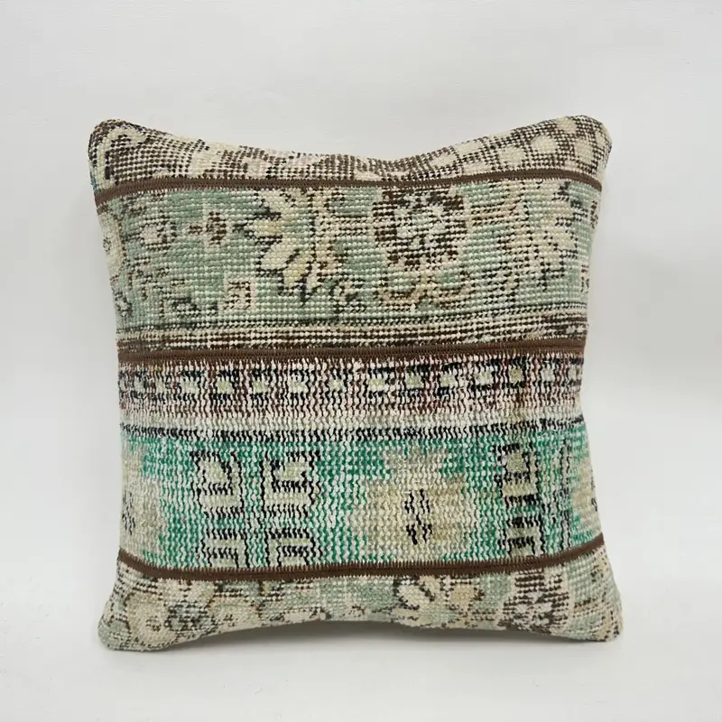 Almohada de lanzamiento de patchwork verde y beige, cojín bordado 16x16