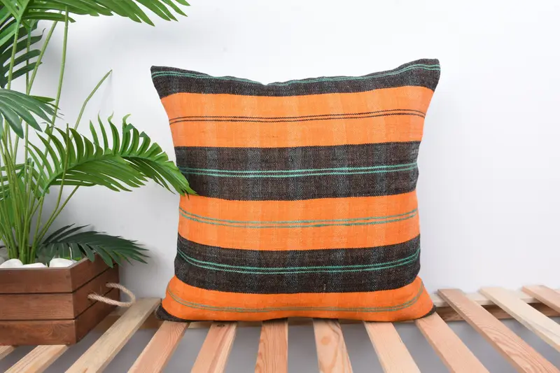 Almohada de tiro a rayas naranja y marrón, cojín bordado vintage