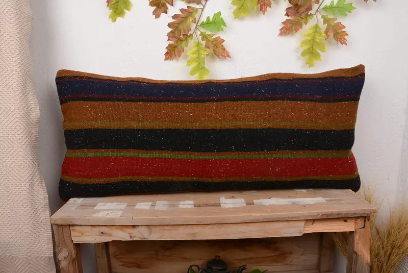 Almohada de tiro a rayas rojas y marrones, almohada de lino bordada hecha a mano