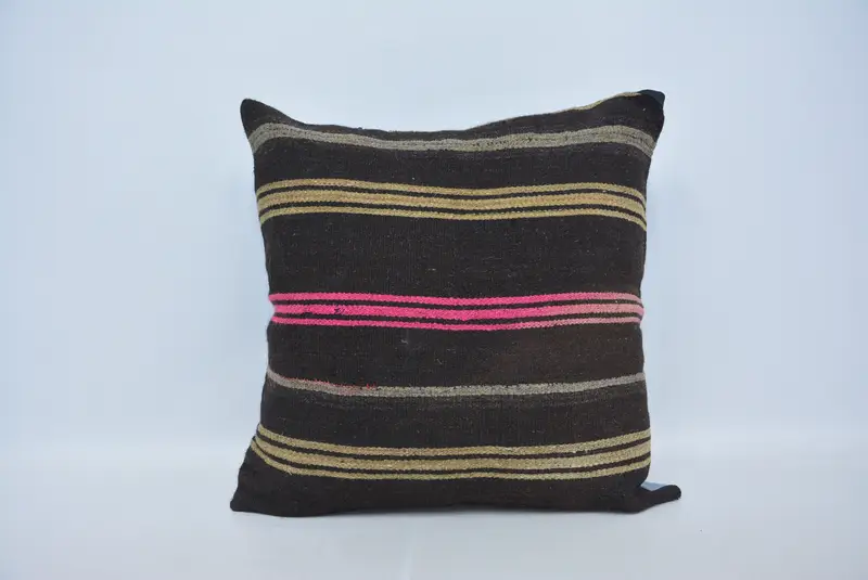 Almohada de tiro a rayas marrón y rosa, cojín bordado vintage