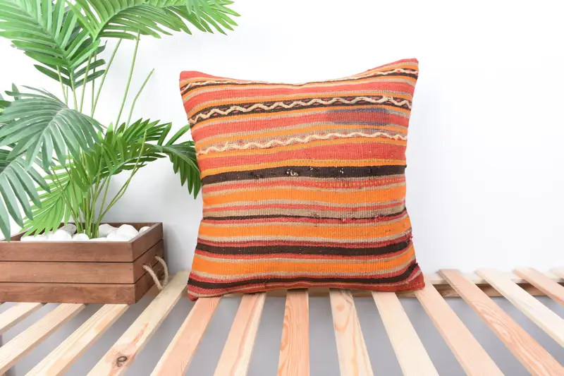 Almohada de tiro a rayas naranja y roja, cojín bordado hecho a mano