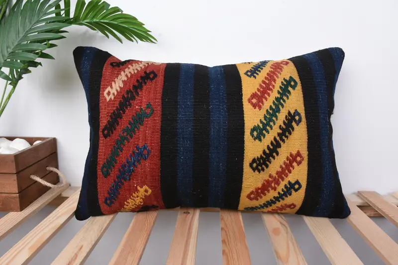 Almohada de tiro bordada azul y amarilla, almohada de lino geométrica hecha a mano