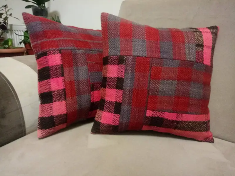 Almohada de lanzamiento de lana de patchwork rojo y rosa, cojín bordado de 16x16 pulgadas