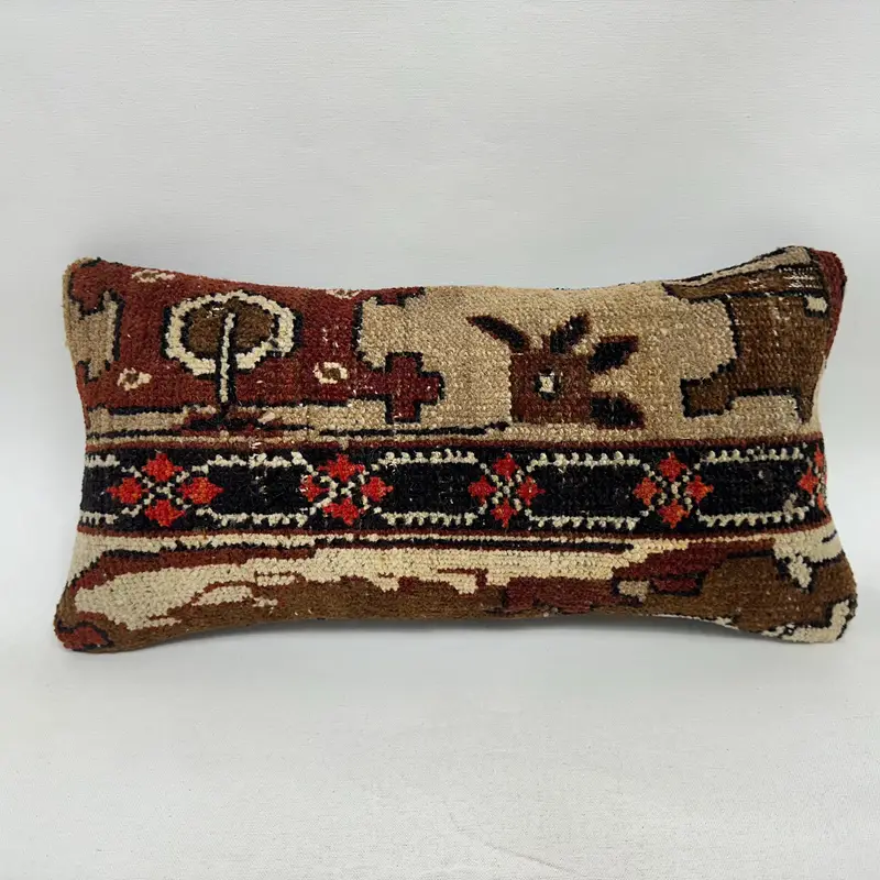 Almohada bordada del suroeste marrón y beige, almohada de lanzamiento rectangular vintage