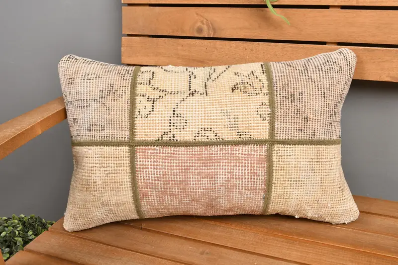 Almohada de patchwork beige y marrón bordada, almohada de tiro hecha a mano de 12x20