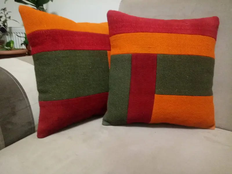 Almohada de lanzamiento de lana de patchwork naranja y verde, cojín bordado hecho a mano