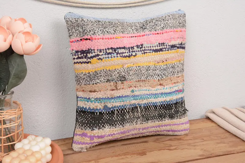 Almohada de tiro a rayas rosa y beige hecha a mano, cojín vintage bordado