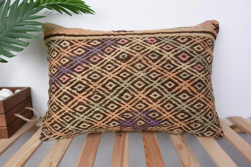 Almohada de tiro Kilim beige con patrón geométrico de bronce, almohada de lino hecha a mano