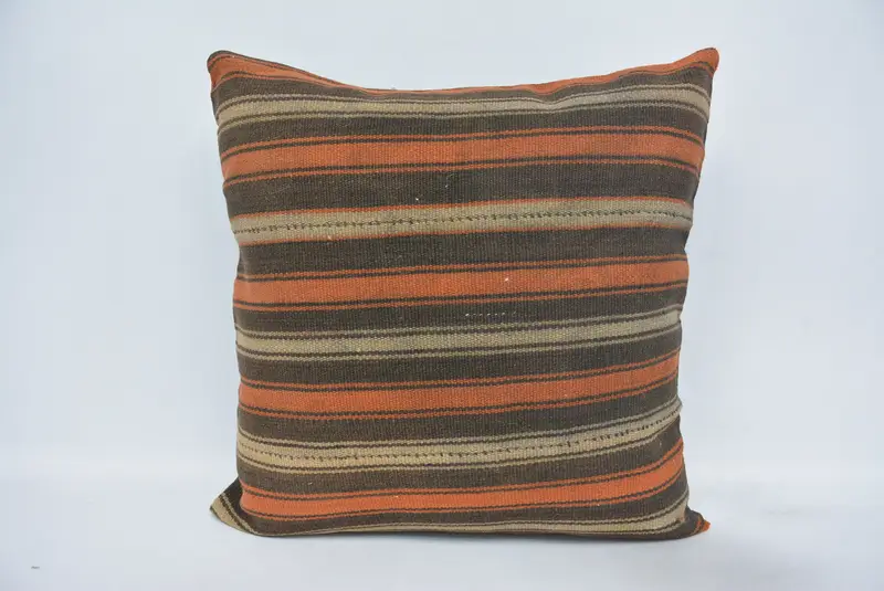 Almohada de tiro de cáñamo a rayas marrón y naranja, almohada bordada vintage