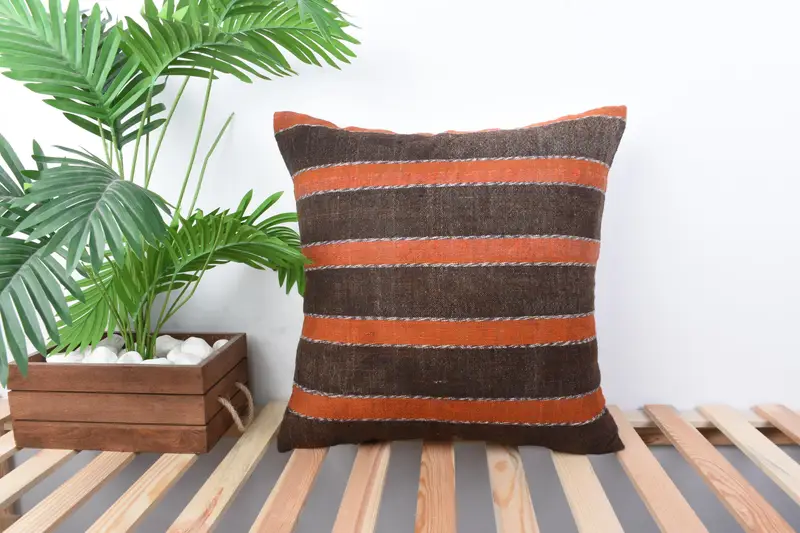 Almohada de rayas marrón y naranja bordada, almohada de lanzamiento hecha a mano