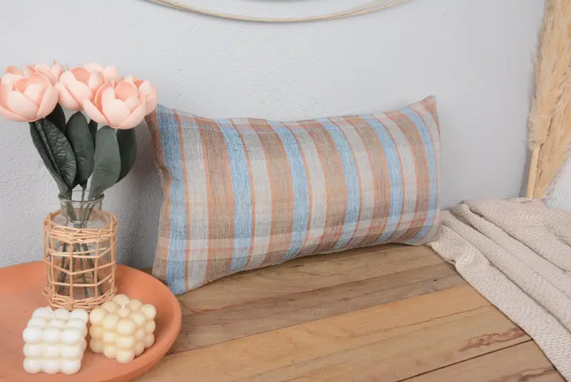 Almohada de tiro a rayas azules y marrones, cojín vintage bordado
