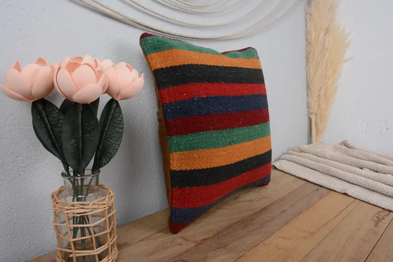 Almohada de tiro a rayas hecha a mano, almohada verde y naranja vintage bordada