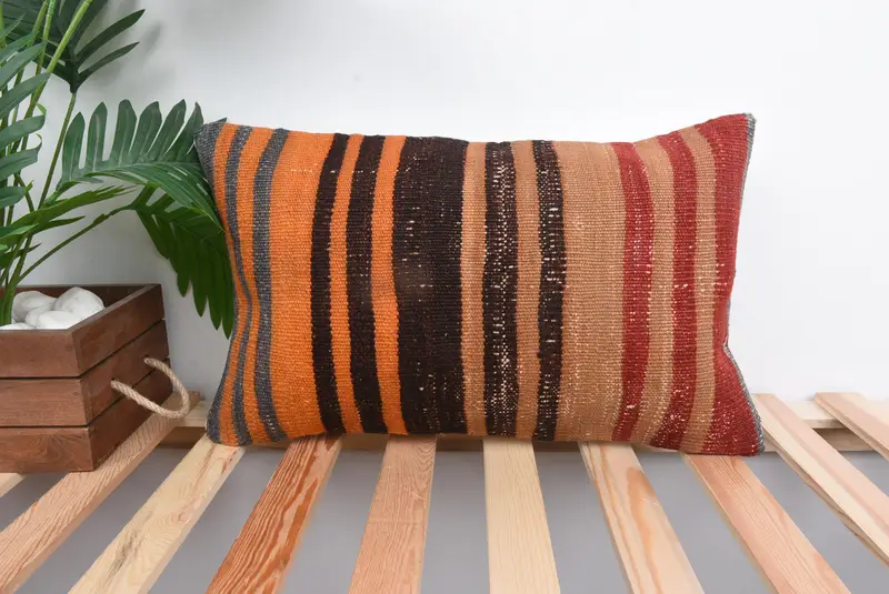 Almohada de tiro de rayas naranja y roja, cojín hecho a mano de 12x20
