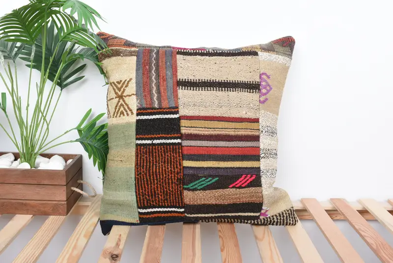 Almohada de lanzamiento de patchwork beige y marrón, cojín bordado 22x22