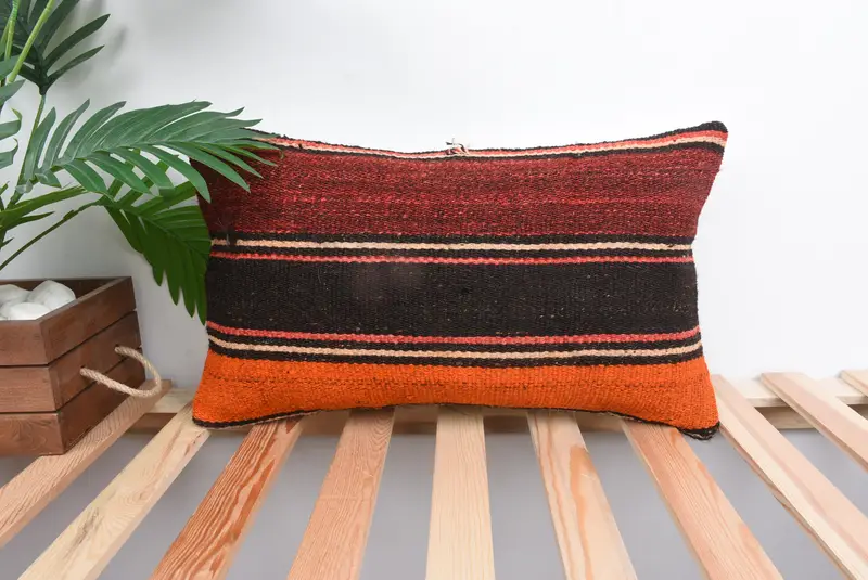 Almohada de tiro a rayas rojas y naranjas, cojín bordado hecho a mano
