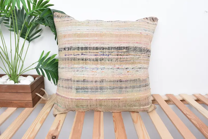 Almohada de tiro a rayas beige y marrón bordada, cojín vintage hecho a mano