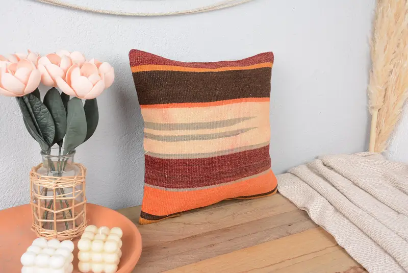 Almohada de tiro a rayas naranja y marrón, cojín bordado 14x14