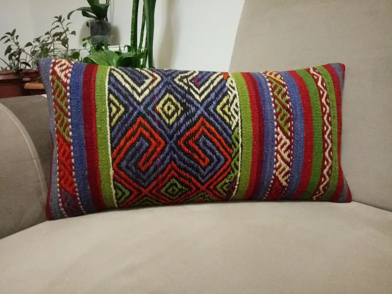 Almohada geométrica de lanzamiento de lana verde y bronce, cojín rectangular hecho a mano